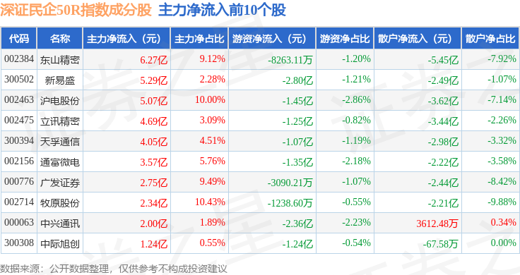 资金流向方面,深证民企50R(470057)指数成份股当日主力资金净流出合计11.84亿元,游资资金净流入合计3.79亿元,散户资金净流入合计8.05亿元。成份股资金流向详情见下表: