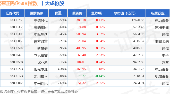 证券之星消息,10月27日,深证民企50R(470057)指数报收于4035.67点,涨1.71%,成交2111.03亿元,换手率2.45%。当日该指数成份股中,上涨的有40家,新易盛以8.31%的涨幅领涨,下跌的有10家,亿纬锂能以4.19%的跌幅领跌。