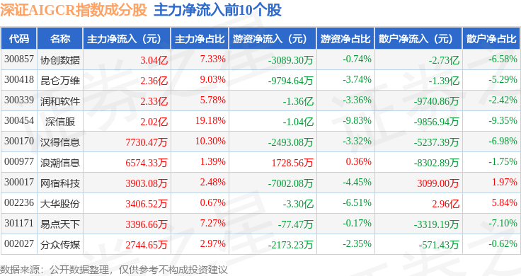 资金流向方面,深证AIGCR(470075)指数成份股当日主力资金净流出合计7.02亿元,游资资金净流出合计3.53亿元,散户资金净流入合计10.55亿元。成份股资金流向详情见下表: