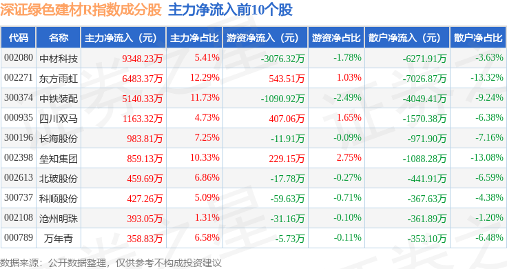 资金流向方面,深证绿色建材R(470077)指数成份股当日主力资金净流出合计2.16亿元,游资资金净流入合计2.11亿元,散户资金净流入合计536.39万元。成份股资金流向详情见下表: