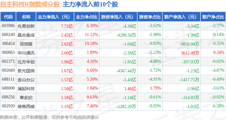 资金流向方面,自主科技R(480033)指数成份股当日主力资金净流入合计12.55亿元,游资资金净流出合计8.03亿元,散户资金净流出合计4.52亿元。成份股资金流向详情见下表: