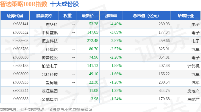 证券之星消息,10月27日,智选策略100R(489015)指数报收于4998.05点,涨2.11%,成交2570.94亿元,换手率2.42%。当日该指数成份股中,上涨的有82家,胜宏科技以10.14%的涨幅领涨,下跌的有16家,杰华特以4.4%的跌幅领跌。