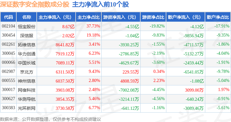 资金流向方面,深证数字安全(970052)指数成份股当日主力资金净流入合计4.22亿元,游资资金净流出合计2.72亿元,散户资金净流出合计1.5亿元。成份股资金流向详情见下表: