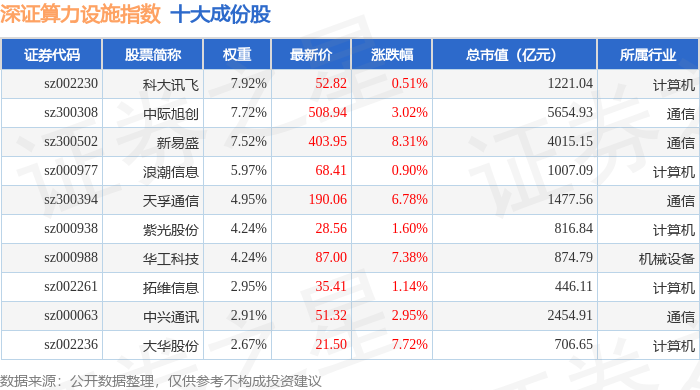 深证算力设施(970051)指数十大成份股详情如下: