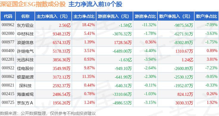 资金流向方面,深证国企ESG(970055)指数成份股当日主力资金净流出合计2.66亿元,游资资金净流出合计3.39亿元,散户资金净流入合计6.04亿元。成份股资金流向详情见下表: