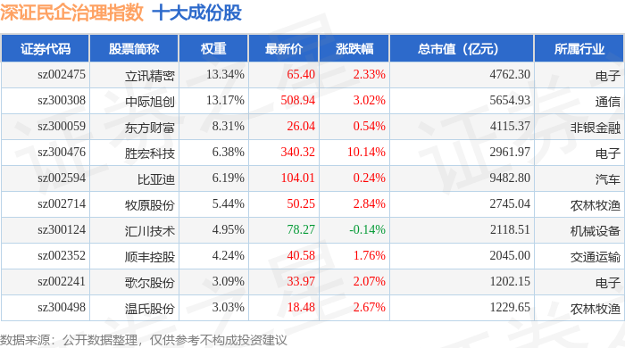 证券之星消息,10月27日,深证民企治理(970058)指数报收于2059.11点,涨2.51%,成交1628.11亿元,换手率2.65%。当日该指数成份股中,上涨的有39家,胜宏科技以10.14%的涨幅领涨,下跌的有11家,锦浪科技以1.73%的跌幅领跌。