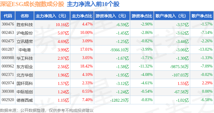 资金流向方面,深证ESG成长(970060)指数成份股当日主力资金净流入合计21.46亿元,游资资金净流出合计15.35亿元,散户资金净流出合计6.1亿元。成份股资金流向详情见下表: