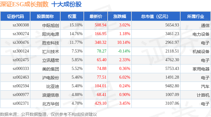 深证ESG成长(970060)指数十大成份股详情如下: