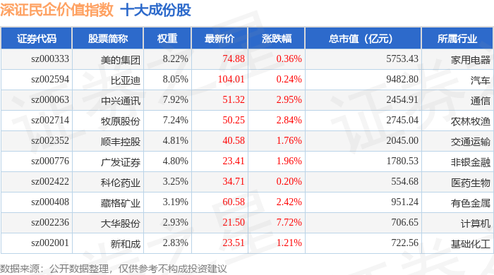 证券之星消息,10月27日,深证民企价值(970072)指数报收于3513.46点,涨1.44%,成交554.56亿元,换手率2.31%。当日该指数成份股中,上涨的有37家,大华股份以7.72%的涨幅领涨,下跌的有12家,龙佰集团以1.69%的跌幅领跌。