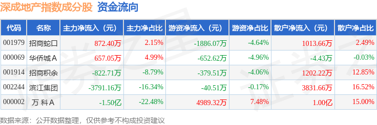 资金流向方面,深成地产(971001)指数成份股当日主力资金净流出合计1.81亿元,游资资金净流入合计2030.61万元,散户资金净流入合计1.6亿元。成份股资金流向详情见下表: