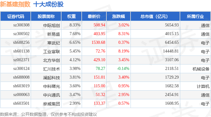 证券之星消息,10月27日,新基建(980029)指数报收于7579.95点,涨2.57%,成交1955.44亿元,换手率1.29%。当日该指数成份股中,上涨的有46家,新易盛以8.31%的涨幅领涨,下跌的有4家,东华软件以0.78%的跌幅领跌。