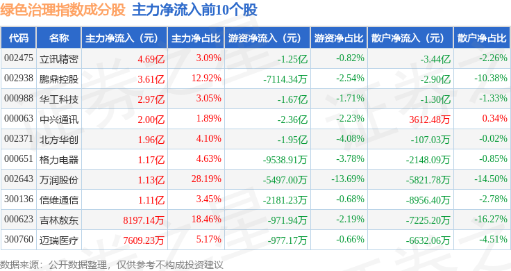 资金流向方面,绿色治理(980058)指数成份股当日主力资金净流出合计20.83亿元,游资资金净流出合计3.0亿元,散户资金净流入合计23.83亿元。成份股资金流向详情见下表: