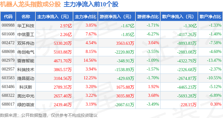 资金流向方面,机器人龙头(980071)指数成份股当日主力资金净流出合计8.13亿元,游资资金净流入合计6.66亿元,散户资金净流入合计1.47亿元。成份股资金流向详情见下表: