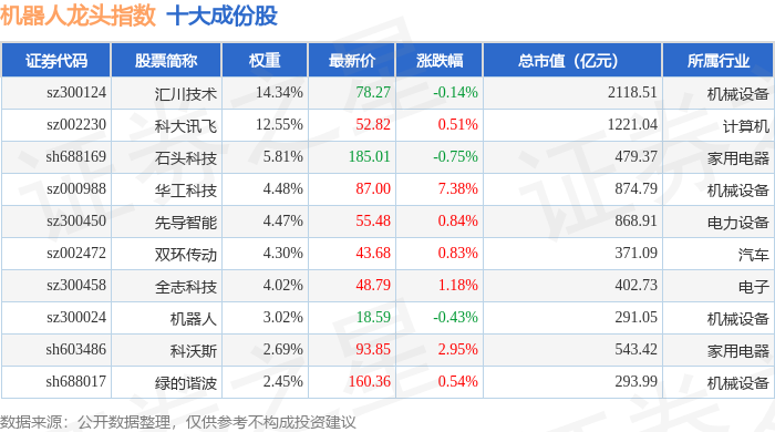 机器人龙头(980071)指数十大成份股详情如下: