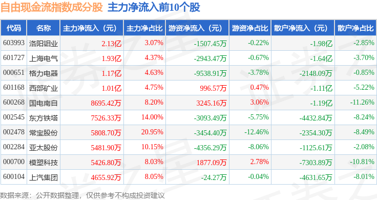 资金流向方面,自由现金流(980092)指数成份股当日主力资金净流出合计9.11亿元,游资资金净流入合计7.2亿元,散户资金净流入合计1.91亿元。成份股资金流向详情见下表: