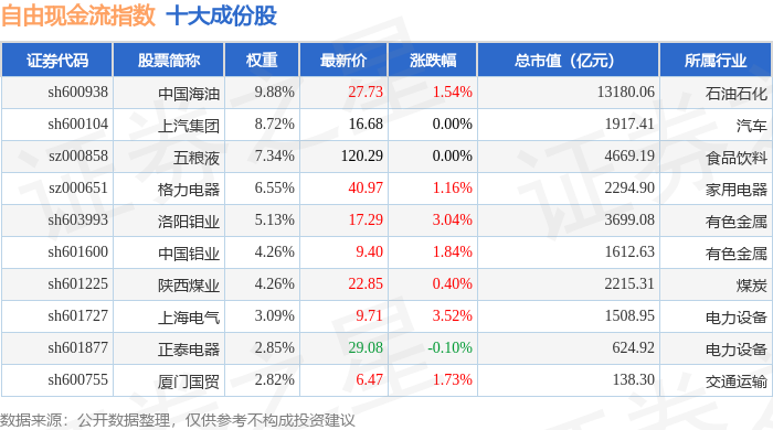 证券之星消息,10月27日,自由现金流(980092)指数报收于5249.14点,涨1.08%,成交696.55亿元,换手率2.09%。当日该指数成份股中,上涨的有68家,东方铁塔以10.0%的涨幅领涨,下跌的有25家,中集车辆以3.77%的跌幅领跌。
