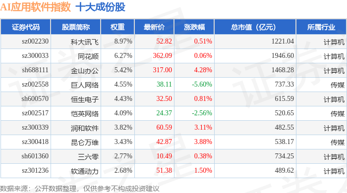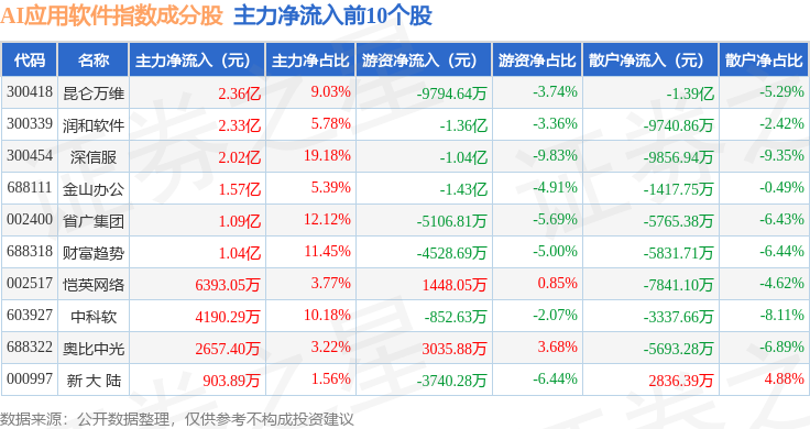 资金流向方面,AI应用软件(980107)指数成份股当日主力资金净流出合计7363.44万元,游资资金净流出合计3.12亿元,散户资金净流入合计3.85亿元。成份股资金流向详情见下表: