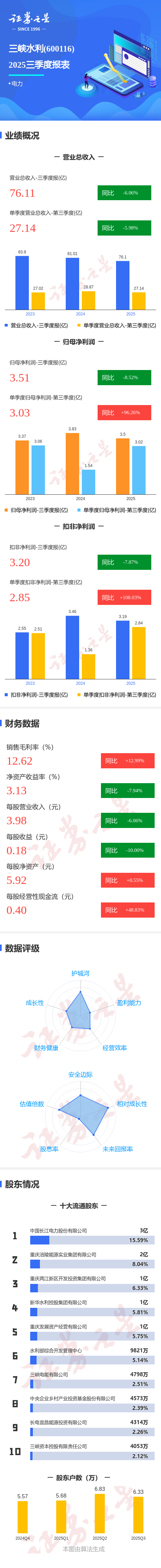 证券之星消息,三峡水利2025年三季报显示,公司主营收入76.11亿元,同比下降6.06%;归母净利润3.51亿元,同比下降8.53%;扣非净利润3.2亿元,同比下降7.87%;其中2025年第三季度,公司单季度主营收入27.14亿元,同比下降5.99%;单季度归母净利润3.03亿元,同比上升96.26%;单季度扣非净利润2.85亿元,同比上升108.03%;负债率55.72%,投资收益7504.25万元,财务费用1.75亿元,毛利率12.62%。