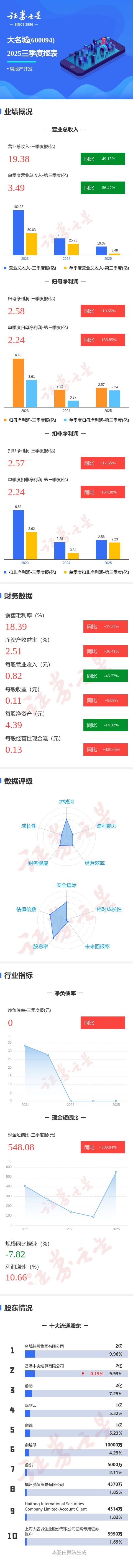证券之星消息,大名城2025年三季报显示,公司主营收入19.38亿元,同比下降49.15%;归母净利润2.58亿元,同比上升10.66%;扣非净利润2.57亿元,同比上升12.55%;其中2025年第三季度,公司单季度主营收入3.49亿元,同比下降86.47%;单季度归母净利润2.24亿元,同比上升156.86%;单季度扣非净利润2.24亿元,同比上升164.31%;负债率35.66%,投资收益3.44亿元,财务费用1.15亿元,毛利率18.39%。