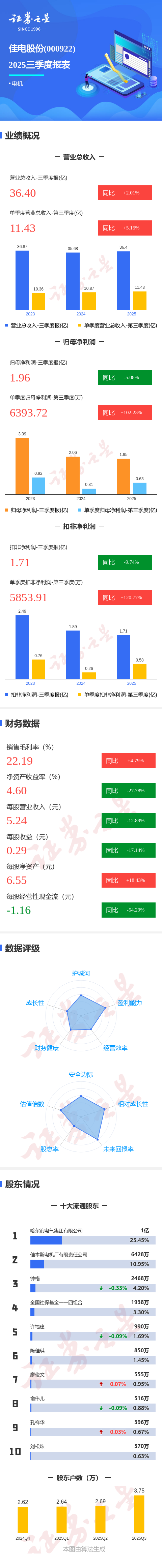 证券之星消息,佳电股份2025年三季报显示,公司主营收入36.4亿元,同比上升2.01%;归母净利润1.96亿元,同比下降5.09%;扣非净利润1.71亿元,同比下降9.74%;其中2025年第三季度,公司单季度主营收入11.43亿元,同比上升5.15%;单季度归母净利润6393.72万元,同比上升102.23%;单季度扣非净利润5853.91万元,同比上升120.77%;负债率46.93%,投资收益77.56万元,财务费用1529.12万元,毛利率22.19%。