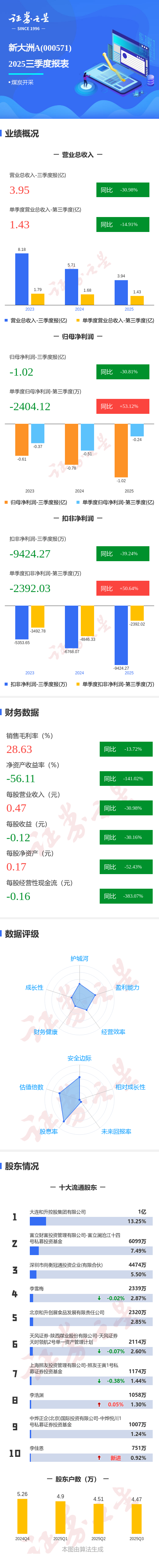 证券之星消息,新大洲A2025年三季报显示,公司主营收入3.95亿元,同比下降30.98%;归母净利润-1.02亿元,同比下降30.82%;扣非净利润-9424.27万元,同比下降39.25%;其中2025年第三季度,公司单季度主营收入1.43亿元,同比下降14.92%;单季度归母净利润-2404.12万元,同比上升53.12%;单季度扣非净利润-2392.03万元,同比上升50.64%;负债率65.95%,投资收益-730.68万元,财务费用3526.58万元,毛利率28.63%。