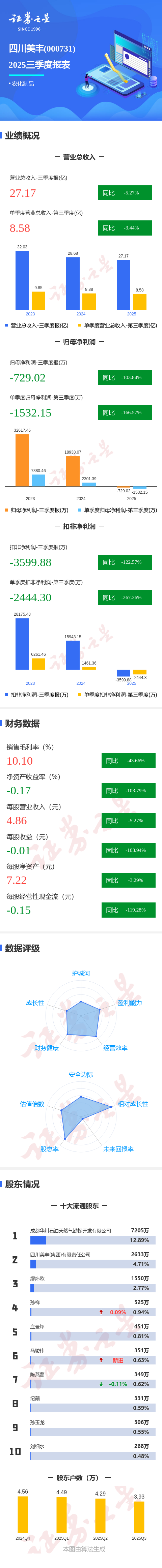 证券之星消息,四川美丰2025年三季报显示,公司主营收入27.17亿元,同比下降5.28%;归母净利润-729.02万元,同比下降103.85%;扣非净利润-3599.88万元,同比下降122.58%;其中2025年第三季度,公司单季度主营收入8.58亿元,同比下降3.44%;单季度归母净利润-1532.15万元,同比下降166.57%;单季度扣非净利润-2444.3万元,同比下降267.26%;负债率15.42%,投资收益2588.72万元,财务费用205.68万元,毛利率10.1%。