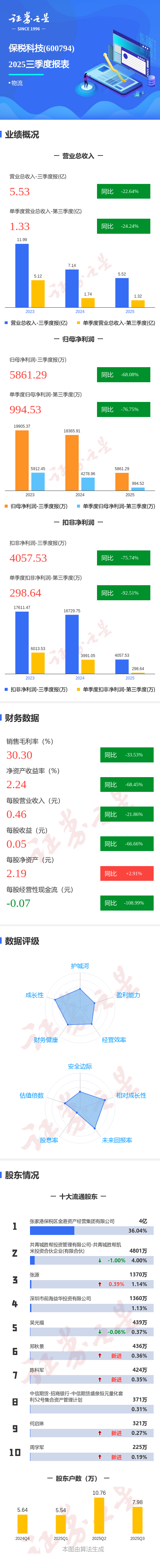 证券之星消息,保税科技2025年三季报显示,公司主营收入5.53亿元,同比下降22.65%;归母净利润5861.29万元,同比下降68.09%;扣非净利润4057.53万元,同比下降75.75%;其中2025年第三季度,公司单季度主营收入1.33亿元,同比下降24.25%;单季度归母净利润994.53万元,同比下降76.76%;单季度扣非净利润298.64万元,同比下降92.52%;负债率8.55%,投资收益1795.86万元,财务费用-162.57万元,毛利率30.3%。