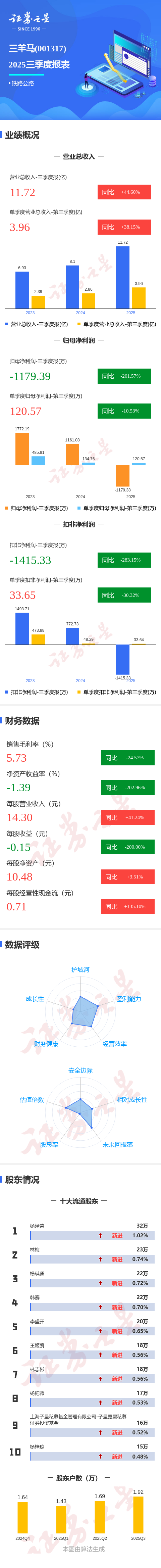 证券之星消息,三羊马2025年三季报显示,公司主营收入11.72亿元,同比上升44.6%;归母净利润-1179.39万元,同比下降201.58%;扣非净利润-1415.33万元,同比下降283.16%;其中2025年第三季度,公司单季度主营收入3.96亿元,同比上升38.16%;单季度归母净利润120.57万元,同比下降10.53%;单季度扣非净利润33.65万元,同比下降30.33%;负债率50.97%,投资收益-69.52万元,财务费用2173.61万元,毛利率5.73%。