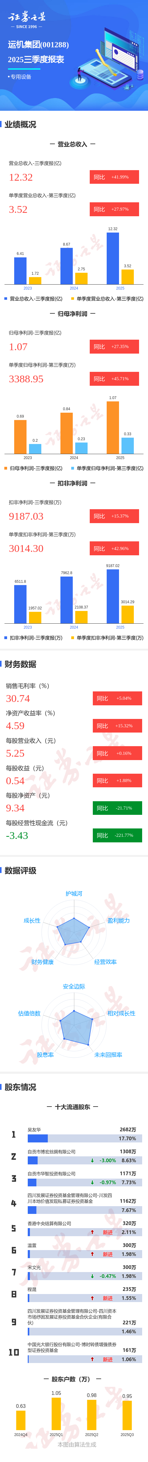 证券之星消息,运机集团2025年三季报显示,公司主营收入12.32亿元,同比上升41.99%;归母净利润1.07亿元,同比上升27.35%;扣非净利润9187.03万元,同比上升15.37%;其中2025年第三季度,公司单季度主营收入3.52亿元,同比上升27.97%;单季度归母净利润3388.95万元,同比上升45.71%;单季度扣非净利润3014.3万元,同比上升42.97%;负债率53.92%,投资收益972.32万元,财务费用1748.94万元,毛利率30.74%。