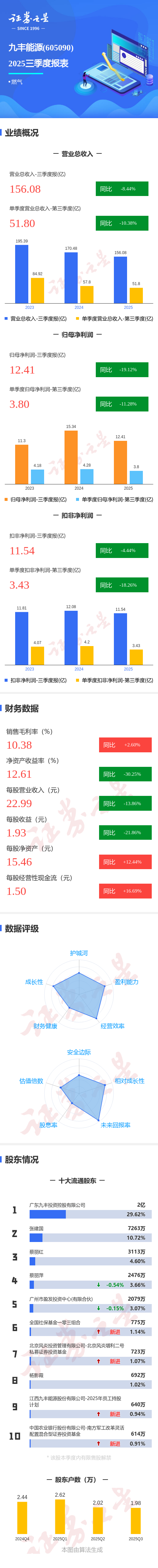 证券之星消息,九丰能源2025年三季报显示,公司主营收入156.08亿元,同比下降8.45%;归母净利润12.41亿元,同比下降19.13%;扣非净利润11.54亿元,同比下降4.44%;其中2025年第三季度,公司单季度主营收入51.8亿元,同比下降10.39%;单季度归母净利润3.8亿元,同比下降11.29%;单季度扣非净利润3.43亿元,同比下降18.26%;负债率32.31%,投资收益1.12亿元,财务费用3882.24万元,毛利率10.38%。