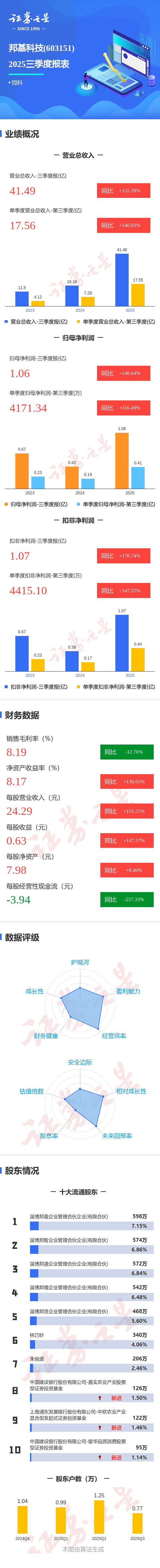 证券之星消息,邦基科技2025年三季报显示,公司主营收入41.49亿元,同比上升155.4%;归母净利润1.06亿元,同比上升148.64%;扣非净利润1.07亿元,同比上升178.75%;其中2025年第三季度,公司单季度主营收入17.56亿元,同比上升140.83%;单季度归母净利润4171.34万元,同比上升116.49%;单季度扣非净利润4415.1万元,同比上升147.22%;负债率53.35%,投资收益259.64万元,财务费用1710.76万元,毛利率8.19%。