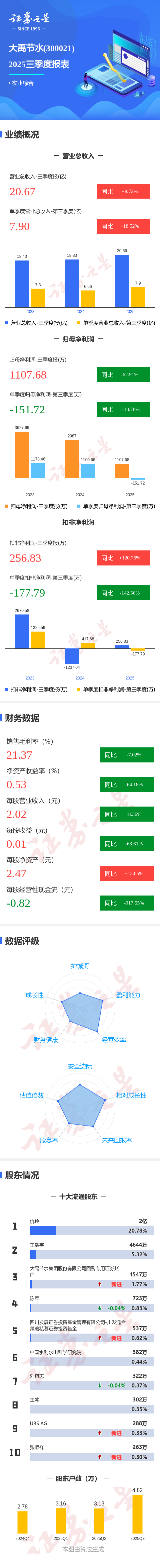 证券之星消息,大禹节水2025年三季报显示,公司主营收入20.67亿元,同比上升9.73%;归母净利润1107.68万元,同比下降62.92%;扣非净利润256.83万元,同比上升120.76%;其中2025年第三季度,公司单季度主营收入7.9亿元,同比上升18.52%;单季度归母净利润-151.72万元,同比下降113.78%;单季度扣非净利润-177.79万元,同比下降142.57%;负债率69.49%,投资收益127.42万元,财务费用6249.9万元,毛利率21.37%。