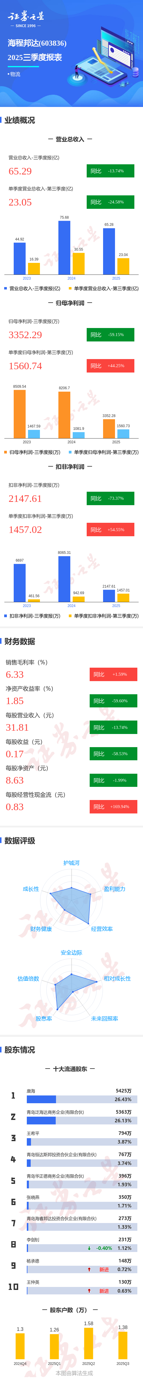 证券之星消息,海程邦达2025年三季报显示,公司主营收入65.29亿元,同比下降13.74%;归母净利润3352.29万元,同比下降59.15%;扣非净利润2147.61万元,同比下降73.37%;其中2025年第三季度,公司单季度主营收入23.05亿元,同比下降24.59%;单季度归母净利润1560.74万元,同比上升44.26%;单季度扣非净利润1457.02万元,同比上升54.56%;负债率48.17%,投资收益1075.6万元,财务费用1996.88万元,毛利率6.33%。
