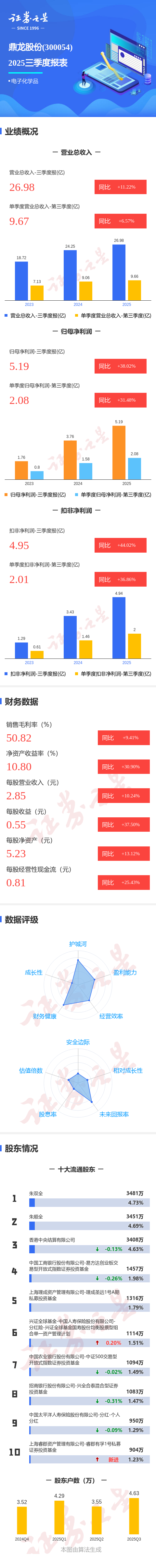 证券之星消息,鼎龙股份2025年三季报显示,公司主营收入26.98亿元,同比上升11.23%;归母净利润5.19亿元,同比上升38.02%;扣非净利润4.95亿元,同比上升44.02%;其中2025年第三季度,公司单季度主营收入9.67亿元,同比上升6.57%;单季度归母净利润2.08亿元,同比上升31.48%;单季度扣非净利润2.01亿元,同比上升36.87%;负债率41.11%,投资收益521.6万元,财务费用3016.09万元,毛利率50.82%。