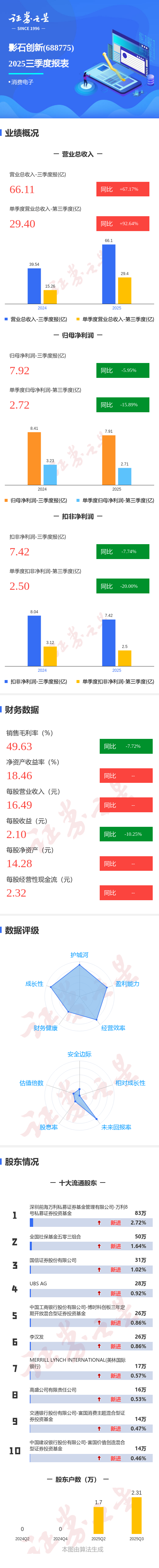 证券之星消息,影石创新2025年三季报显示,公司主营收入66.11亿元,同比上升67.18%;归母净利润7.92亿元,同比下降5.95%;扣非净利润7.42亿元,同比下降7.74%;其中2025年第三季度,公司单季度主营收入29.4亿元,同比上升92.64%;单季度归母净利润2.72亿元,同比下降15.9%;单季度扣非净利润2.5亿元,同比下降20.01%;负债率37.85%,投资收益3031.98万元,财务费用1143.18万元,毛利率49.63%。