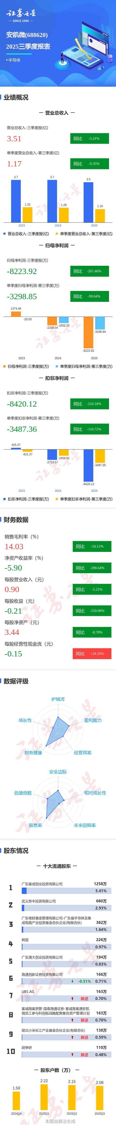 证券之星消息,安凯微2025年三季报显示,公司主营收入3.51亿元,同比下降5.22%;归母净利润-8223.92万元,同比下降267.46%;扣非净利润-8420.12万元,同比下降210.18%;其中2025年第三季度,公司单季度主营收入1.17亿元,同比下降9.36%;单季度归母净利润-3298.85万元,同比下降99.65%;单季度扣非净利润-3487.36万元,同比下降110.73%;负债率14.61%,投资收益13.13万元,财务费用-1285.61万元,毛利率14.03%。