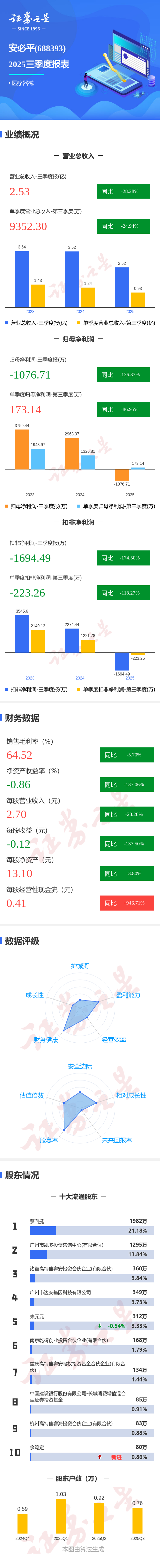证券之星消息,安必平2025年三季报显示,公司主营收入2.53亿元,同比下降28.29%;归母净利润-1076.71万元,同比下降136.34%;扣非净利润-1694.49万元,同比下降174.5%;其中2025年第三季度,公司单季度主营收入9352.3万元,同比下降24.95%;单季度归母净利润173.14万元,同比下降86.95%;单季度扣非净利润-223.26万元,同比下降118.27%;负债率8.64%,投资收益85.61万元,财务费用-361.35万元,毛利率64.52%。