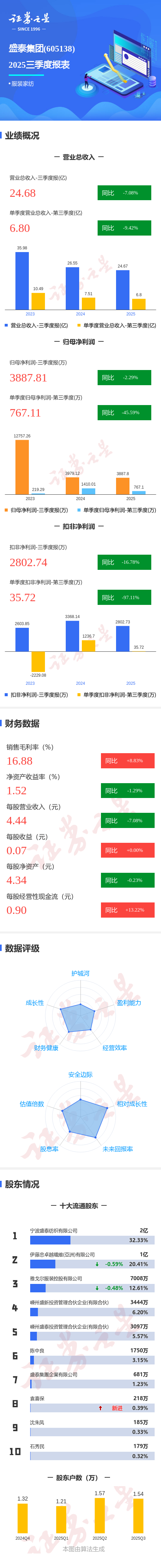 证券之星消息,盛泰集团2025年三季报显示,公司主营收入24.68亿元,同比下降7.09%;归母净利润3887.81万元,同比下降2.29%;扣非净利润2802.74万元,同比下降16.79%;其中2025年第三季度,公司单季度主营收入6.8亿元,同比下降9.42%;单季度归母净利润767.11万元,同比下降45.6%;单季度扣非净利润35.72万元,同比下降97.11%;负债率60.61%,投资收益-958.44万元,财务费用9344.2万元,毛利率16.88%。
