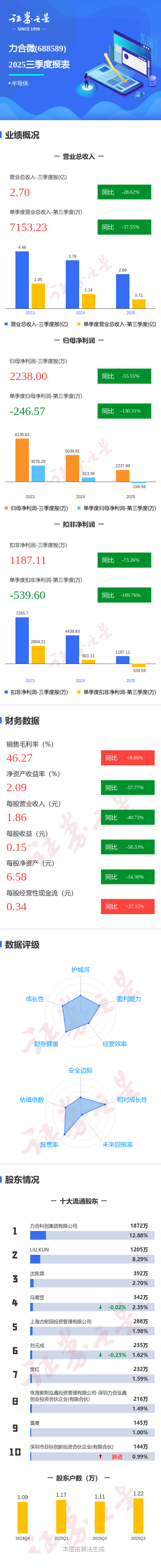 证券之星消息,力合微2025年三季报显示,公司主营收入2.7亿元,同比下降28.62%;归母净利润2238.0万元,同比下降55.55%;扣非净利润1187.11万元,同比下降73.26%;其中2025年第三季度,公司单季度主营收入7153.23万元,同比下降37.56%;单季度归母净利润-246.57万元,同比下降130.31%;单季度扣非净利润-539.6万元,同比下降189.77%;负债率30.09%,投资收益796.86万元,财务费用1038.33万元,毛利率46.27%。