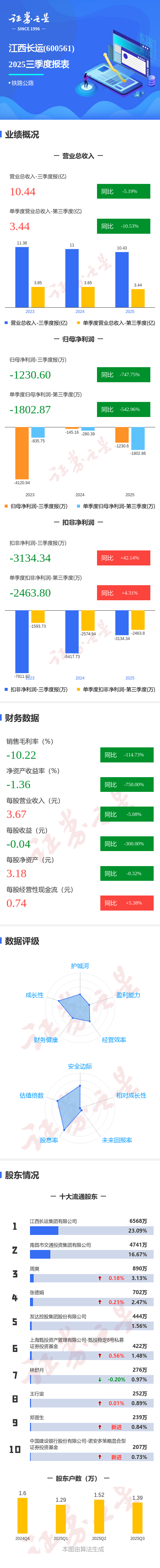 证券之星消息,江西长运2025年三季报显示,公司主营收入10.44亿元,同比下降5.2%;归母净利润-1230.6万元,同比下降747.75%;扣非净利润-3134.34万元,同比上升42.15%;其中2025年第三季度,公司单季度主营收入3.44亿元,同比下降10.54%;单季度归母净利润-1802.87万元,同比下降542.97%;单季度扣非净利润-2463.8万元,同比上升4.32%;负债率74.96%,投资收益255.65万元,财务费用5055.47万元,毛利率-10.21%。