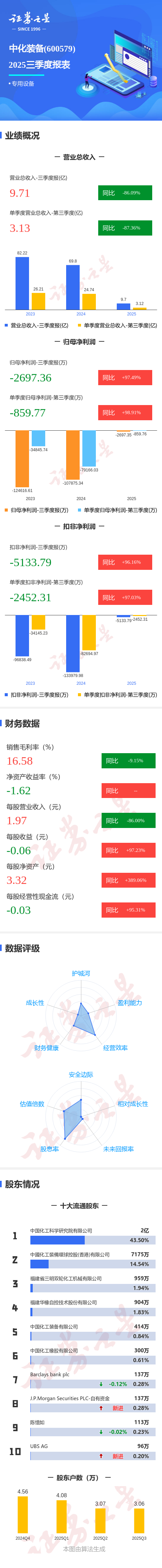 证券之星消息,中化装备2025年三季报显示,公司主营收入9.71亿元,同比下降86.09%;归母净利润-2697.36万元,同比上升97.5%;扣非净利润-5133.79万元,同比上升96.17%;其中2025年第三季度,公司单季度主营收入3.13亿元,同比下降87.36%;单季度归母净利润-859.77万元,同比上升98.91%;单季度扣非净利润-2452.31万元,同比上升97.03%;负债率55.35%,投资收益-1530.9万元,财务费用1133.85万元,毛利率16.58%。