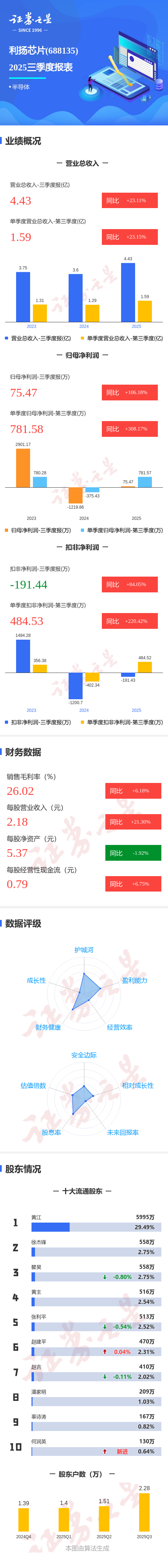 证券之星消息,利扬芯片2025年三季报显示,公司主营收入4.43亿元,同比上升23.11%;归母净利润75.47万元,同比上升106.19%;扣非净利润-191.44万元,同比上升84.06%;其中2025年第三季度,公司单季度主营收入1.59亿元,同比上升23.15%;单季度归母净利润781.58万元,同比上升308.18%;单季度扣非净利润484.53万元,同比上升220.43%;负债率55.25%,投资收益126.82万元,财务费用3065.01万元,毛利率26.02%。