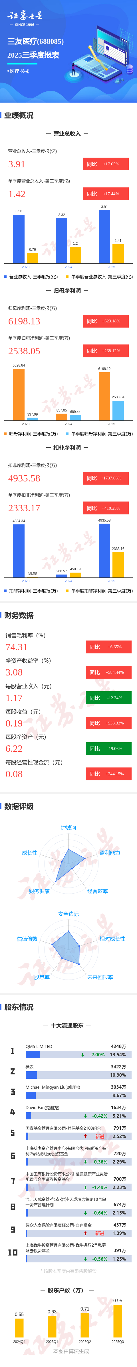 证券之星消息,三友医疗2025年三季报显示,公司主营收入3.91亿元,同比上升17.65%;归母净利润6198.13万元,同比上升623.19%;扣非净利润4935.58万元,同比上升1737.69%;其中2025年第三季度,公司单季度主营收入1.42亿元,同比上升17.44%;单季度归母净利润2538.05万元,同比上升268.13%;单季度扣非净利润2333.17万元,同比上升418.26%;负债率10.57%,投资收益-194.59万元,财务费用-874.59万元,毛利率74.31%。