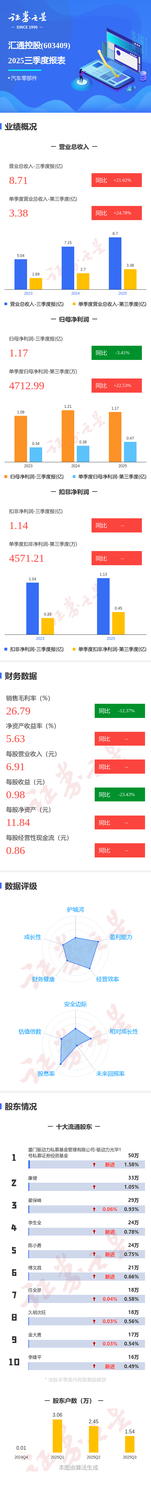 证券之星消息,汇通控股2025年三季报显示,公司主营收入8.71亿元,同比上升21.63%;归母净利润1.17亿元,同比下降3.41%;扣非净利润1.14亿元,其中2025年第三季度,公司单季度主营收入3.38亿元,同比上升24.79%;单季度归母净利润4712.99万元,同比上升22.53%;单季度扣非净利润4571.21万元,负债率28.22%,财务费用114.15万元,毛利率26.79%。