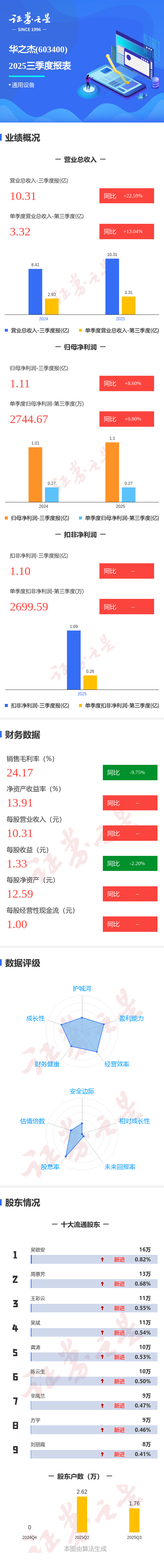 证券之星消息,华之杰2025年三季报显示,公司主营收入10.31亿元,同比上升22.6%;归母净利润1.11亿元,同比上升8.6%;扣非净利润1.1亿元,其中2025年第三季度,公司单季度主营收入3.32亿元,同比上升13.05%;单季度归母净利润2744.67万元,同比上升0.81%;单季度扣非净利润2699.59万元,负债率31.07%,财务费用-591.57万元,毛利率24.17%。