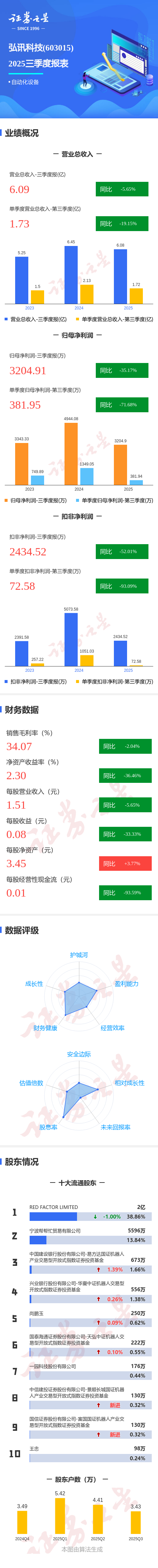 证券之星消息,弘讯科技2025年三季报显示,公司主营收入6.09亿元,同比下降5.65%;归母净利润3204.91万元,同比下降35.18%;扣非净利润2434.52万元,同比下降52.02%;其中2025年第三季度,公司单季度主营收入1.73亿元,同比下降19.15%;单季度归母净利润381.95万元,同比下降71.69%;单季度扣非净利润72.58万元,同比下降93.09%;负债率33.66%,投资收益371.25万元,财务费用1347.52万元,毛利率34.07%。