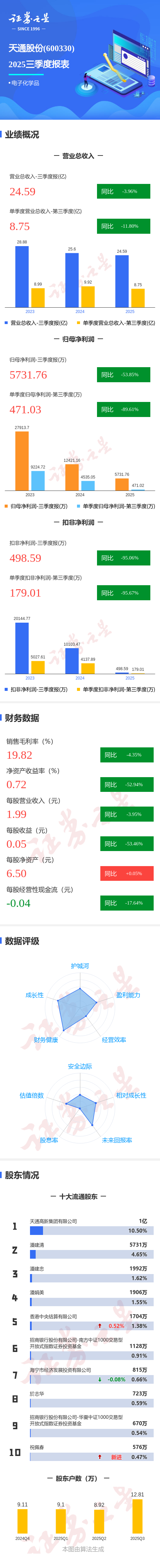 证券之星消息,天通股份2025年三季报显示,公司主营收入24.59亿元,同比下降3.96%;归母净利润5731.76万元,同比下降53.85%;扣非净利润498.59万元,同比下降95.07%;其中2025年第三季度,公司单季度主营收入8.75亿元,同比下降11.8%;单季度归母净利润471.03万元,同比下降89.61%;单季度扣非净利润179.01万元,同比下降95.67%;负债率30.61%,投资收益508.57万元,财务费用285.22万元,毛利率19.82%。