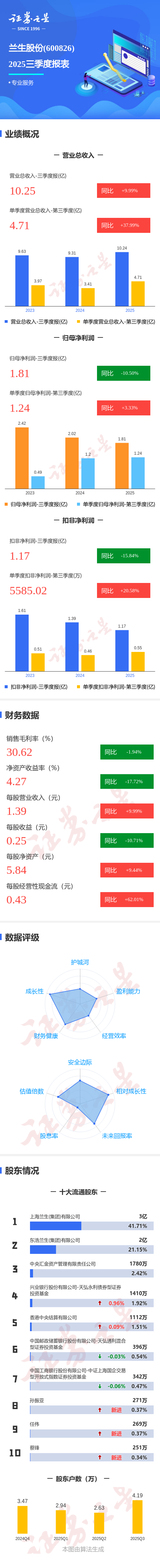 证券之星消息,兰生股份2025年三季报显示,公司主营收入10.25亿元,同比上升10.0%;归母净利润1.81亿元,同比下降10.51%;扣非净利润1.17亿元,同比下降15.85%;其中2025年第三季度,公司单季度主营收入4.71亿元,同比上升38.0%;单季度归母净利润1.24亿元,同比上升3.33%;单季度扣非净利润5585.02万元,同比上升20.59%;负债率26.24%,投资收益5904.83万元,财务费用647.53万元,毛利率30.62%。