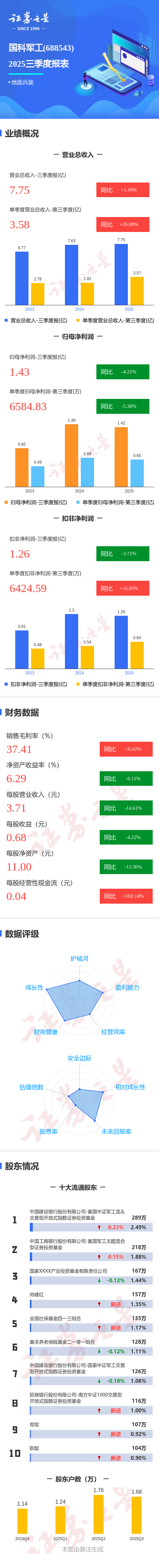 证券之星消息,国科军工2025年三季报显示,公司主营收入7.75亿元,同比上升1.49%;归母净利润1.43亿元,同比下降4.21%;扣非净利润1.26亿元,同比下降3.71%;其中2025年第三季度,公司单季度主营收入3.58亿元,同比上升26.89%;单季度归母净利润6584.83万元,同比下降5.39%;单季度扣非净利润6424.59万元,同比上升16.85%;负债率25.98%,投资收益138.59万元,财务费用-996.36万元,毛利率37.41%。