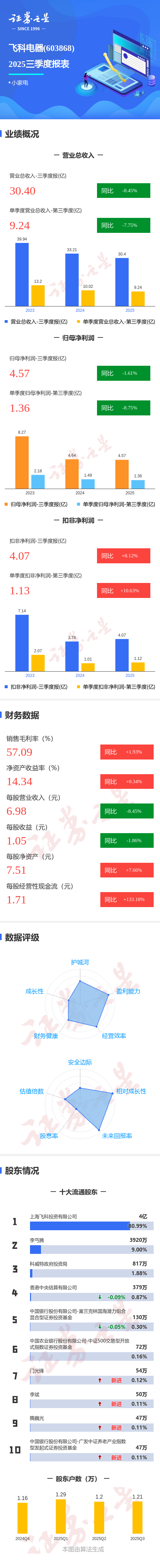 证券之星消息,飞科电器2025年三季报显示,公司主营收入30.4亿元,同比下降8.46%;归母净利润4.57亿元,同比下降1.61%;扣非净利润4.07亿元,同比上升8.13%;其中2025年第三季度,公司单季度主营收入9.24亿元,同比下降7.75%;单季度归母净利润1.36亿元,同比下降8.76%;单季度扣非净利润1.13亿元,同比上升10.64%;负债率16.02%,投资收益331.95万元,财务费用-8.43万元,毛利率57.09%。